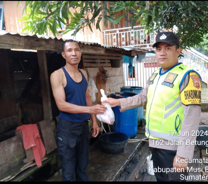 Rupanya yang datang tersebut adalah Bhabinkamtibmas sat Bimmas Polres Muba sambil membawa kantong plastik yang berisi daging sapi dan membagikannya kepada warga slum area pada hari raya Idul Adha 10 Dzulhijjah 1445 H ini, yang mana daging tersebut merupakan daging qurban para personil polres Muba .