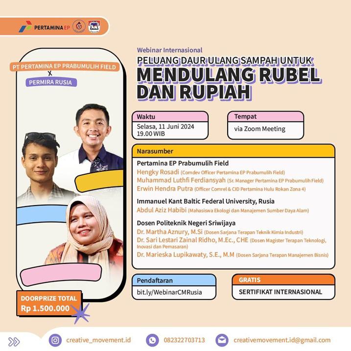 11 Juni 2024 – Pertamina EP (PEP) Prabumulih Field bekerja sama dengan Perhimpunan Mahasiswa Indonesia di Rusia (Permira) yang merupakan salah satu organisasi kepemudaan di negara Rusia, menggelar Seminar Internasional dengan mengangkat tema “Pusat Daur Ulang Sampah Mandiri dan Berkelanjutan” secara daring, yang diikuti oleh 200 orang peserta yang berasal dari berbagai daerah di Indonesia dan beberapa negara asia lainnya, seperti Pakistan, Thailand dan Rusia, pada Selasa, 11 Juni 2024.