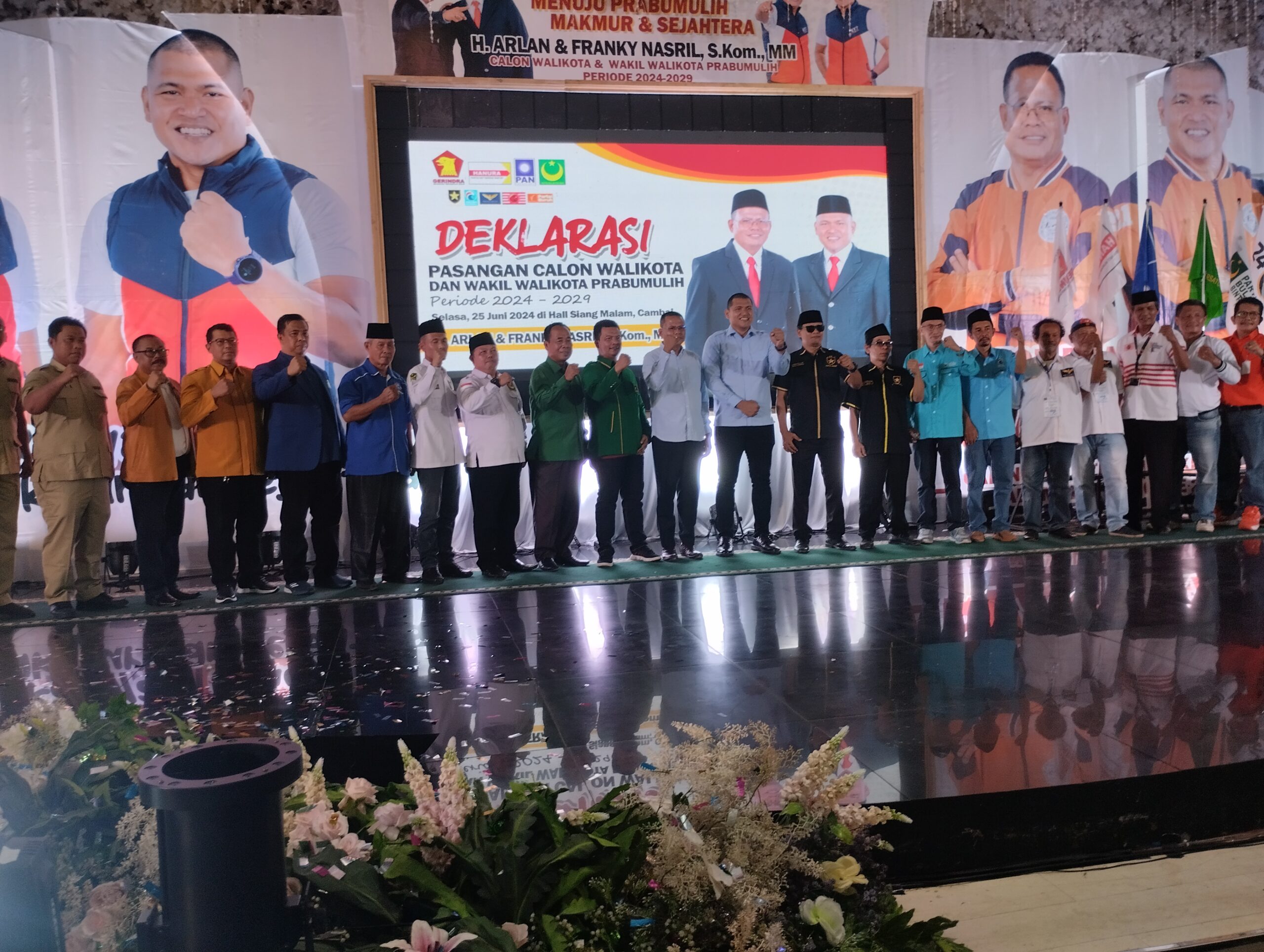 Menuju Pilkada 2024, pasangan H.Arlan dan Frangky Nasril,S.Kom.MM gelar deklarasi dengan tema bersama rakyat menuju Prabumulih makmur dan sejahtera, yang di adakan di hall rumah makan siang malam jalan jendral Sudirman kecamatan cambai Prabumulih (Selasa, 25/6/2024)