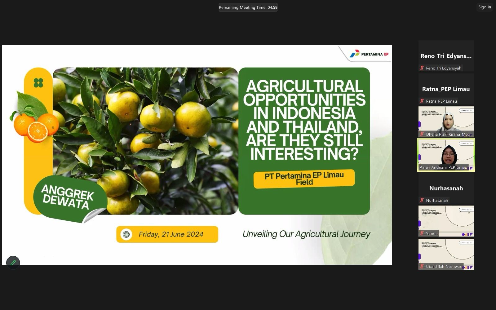 PT Pertamina EP (PEP) Limau Field menyelenggarakan Seminar Internasional yang dijajaki bersama Perhimpunan Mahasiswa Indonesia Thailand (PERMITHA) dan Creative Movement Indonesia yang bertajuk “Peluang Pertanian di Indonesia dan Thailand, Apakah Masih Menggiurkan?”. Kegiatan tersebut berlangsung secara daring dan dihadiri oleh kurang lebih 200 peserta yang terdiri dari perwira PEP Limau Field, Mahasiswa Khon Kaen University, dan masyarakat umum dari negara Indonesia dan Thailand, pada Jumat (21/06).