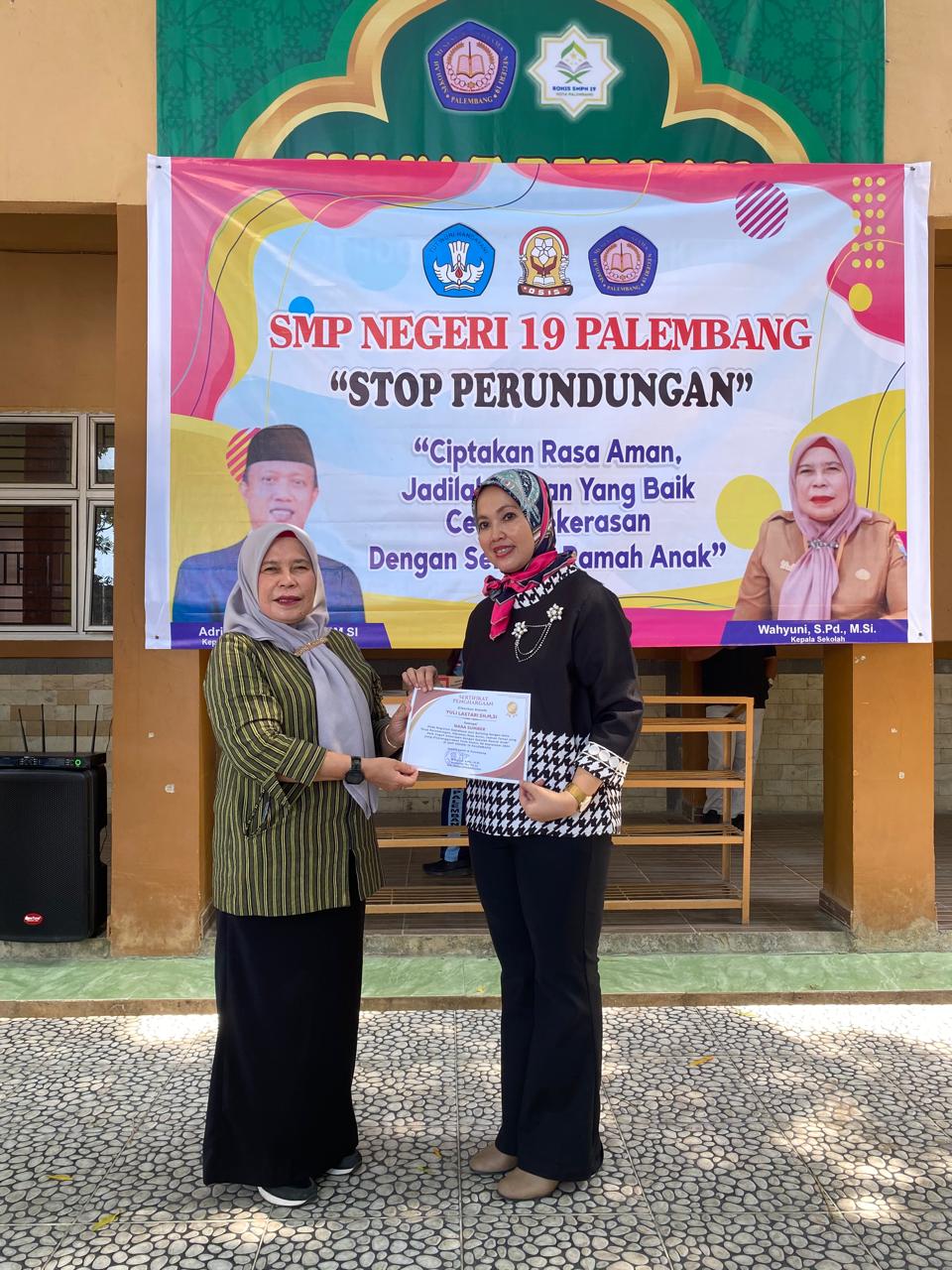 Dalam kegiatan Stop Perundungan ini langsung hadir narasumber Yuli Lastari SH.M.Si dari Kementerian Perlindungan Anak Kota Palembang., dan semua guru SMPN 19 Palembang beserta seluruh Siswa-siswi SMPN 19 Palembang.