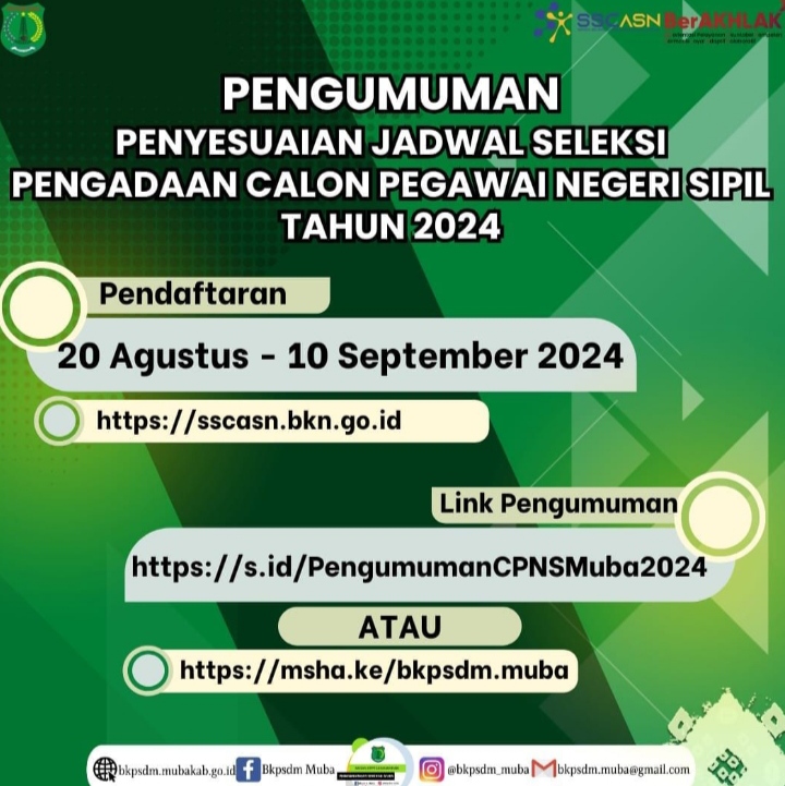 MUBA,sriwijaya hariini.com,, – Secara resmi telah diputuskan bahwasanya Pendaftaran CPNS Diperpanjang Hingga 10 September 2024. Penyesuaian jadwal pendaftaran ini bertujuan untuk mengakomodir para pelamar yang belum berhasil menyelesaikan tahapan pendaftaran di portal.