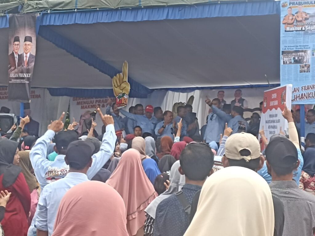 Ribuan massa padati lapangan kantor baru kelurahan Cambai kecamatan Cambai kota Prabumulih Minggu 29/09/2024 , walaupun dalam kondisi cuaca yang tidak menentu gerimis hujan tidak menyurutkan antusiasme masyarakat pecinta “Laky”untuk dapat bertatap muka langsung dengan Calon Walikota Prabumulih idola masyarakat yaitu H Arlan dan Franky Nasril.