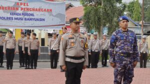 MUBA,sriwijaya hariini.com,,- Sebagai bentuk apresiasi atas dedikasi dan prestasi yang ditorehkan, Kapolres Musi Banyuasin AKBP Listiyono Dwi Nugroho, SIK, MH, memberikan penghargaan kepada Kapolsek Lalan IPTU Zulkarnain Afianata, ST, M.Si, MH dan 36 personel Jajaran Polres Muba dalam upacara Apel Pagi yang dilaksanakan di halaman Mapolres Musi Banyuasin (Muba). Senin (21/10/2024) sekira pukul 07.30 Wib s/d selesai.