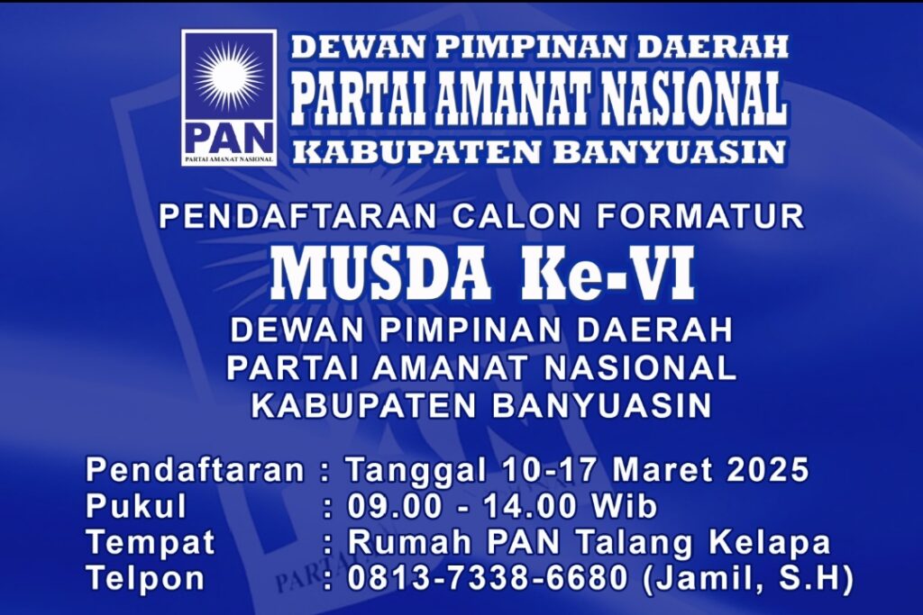 Banyuasin – Sriwijaya-Hariini.com,- Dewan Pimpinan Daerah Partai Amanat Nasional (DPD PAN) Kabupaten Banyuasin resmi membuka pendaftaran Calon Formatur Musyawarah Daerah (Musda) VI DPD PAN Kabupaten Banyuasin tahun 2025.