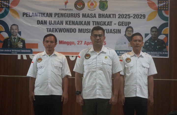 MUBA,sriwijaya hariini.com,,- Pendim 0401/Muba – Letkol Inf Erry Dwianto, S.Psi., M. Han. Dandim 0401/Muba resmi dilantik sebagai Ketua Pengurus Taekwondo Indonesia (TI) Kabupaten Musi Banyuasin periode 2025–2029. Pelantikan dilakukan langsung oleh Ketua Umum Pengurus Provinsi T.I Sumatra Selatan (Ketua Pengprov Sumsel), Hj. Mailinda, S. Sos.,M.M. bertempat di Ruang Aula Kodim 0401/Muba, Jl. Kol. Wahid Udin, Serasan Jaya, Kec. Sekayu, Kabupaten Musi Banyuasin, Minggu (27/4/2025).
