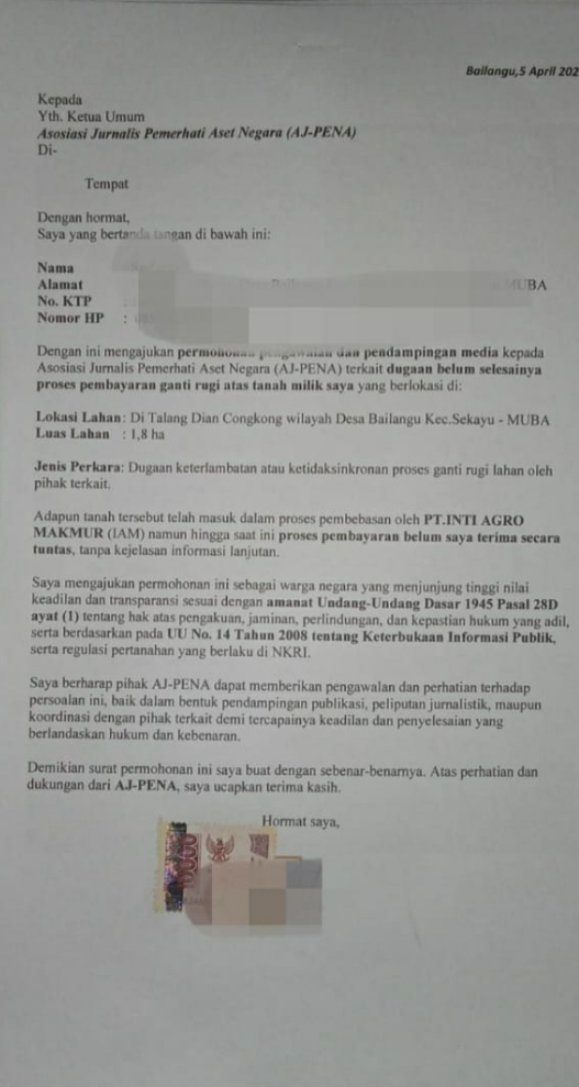 Keluhan tersebut diterima tim media Asosiasi Jurnalis Pemerhati Aset Negara (AJ-PENA) pada 5 April 2025. Menurut pengakuan warga, PT IAM sempat membayar sebagian ganti rugi senilai Rp250 juta, namun sisa lahan seluas 1,8 hektare masih belum diganti rugi sebagaimana mestinya.