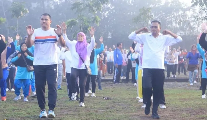 Sejak pagi, alunan musik energik mengiringi gerakan senam yang diikuti oleh para pejabat, ASN, hingga masyarakat umum. Semangat para peserta tidak surut meski terik matahari mulai menyengat. Mulai dari anak muda hingga para lansia, semua bergerak kompak mengikuti instruktur yang memandu di atas panggung.
