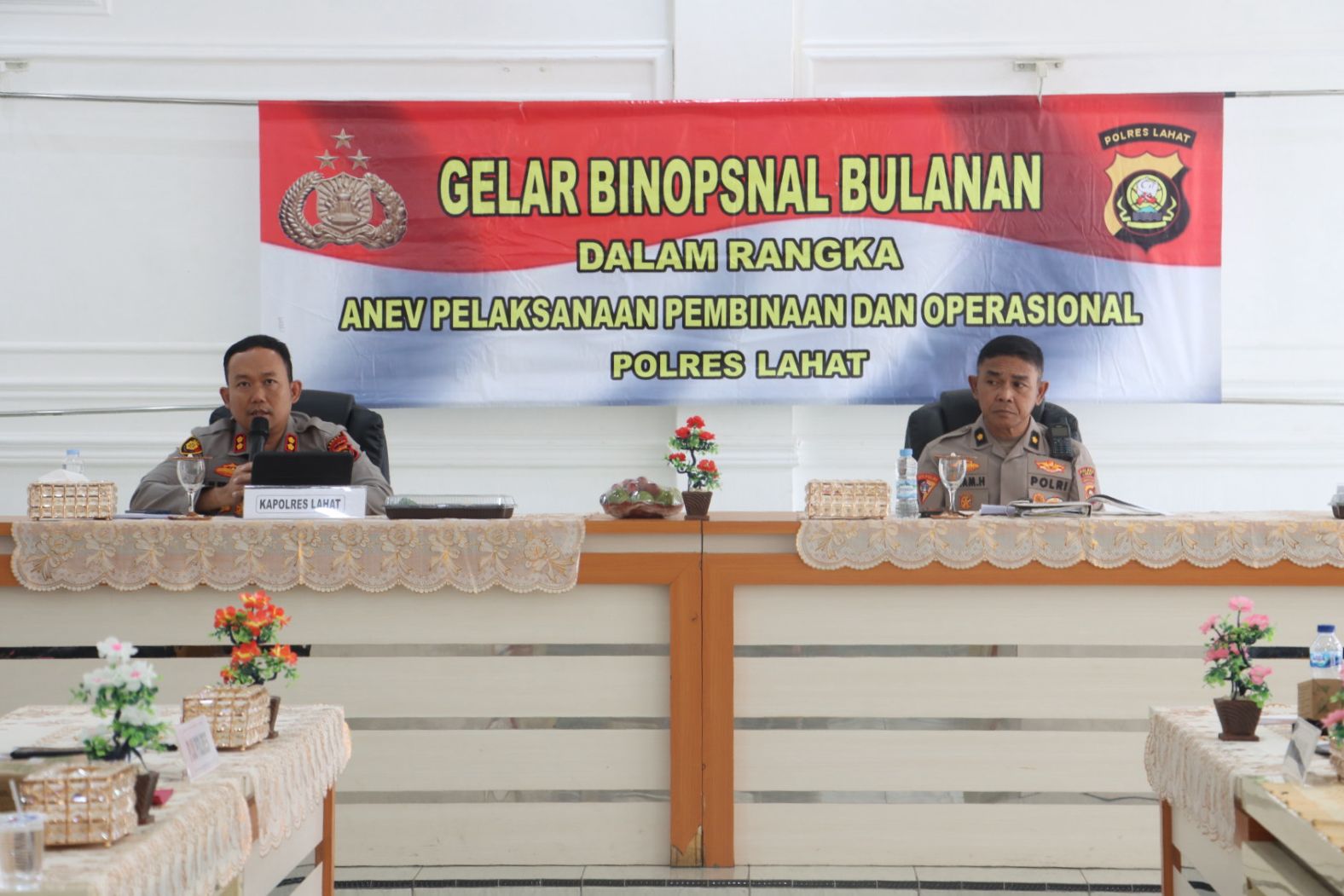 Humas Polres Lahat, pada hsri senin, 2 Juni 2025 – Kapolres Lahat, AKBP Novi Edyanto, S.I.K., M.I.K., memimpin langsung kegiatan Gelar Pembinaan dan Operasional (Bin Opsnal) bulanan dalam rangka Analisa dan Evaluasi (Anev) pelaksanaan pembinaan dan operasional jajaran Polres Lahat. Kegiatan ini dihadiri oleh para pejabat utama, kapolsek jajaran, serta para perwira staf Polres Lahat.