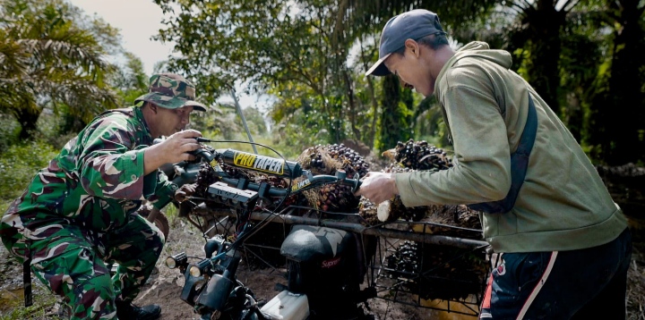 Dedi Pria 38 tahun yang merupakan warga desa Pinang Bajar dibantu Serda Andre Pratono Anggota Satgas TMMD saat membawa hasil panen kelapa sawit dari kebunnya nyaris terpelosok ke pinggiran Paret akibat jalan yang licin dan belum selesai di perbaiki.