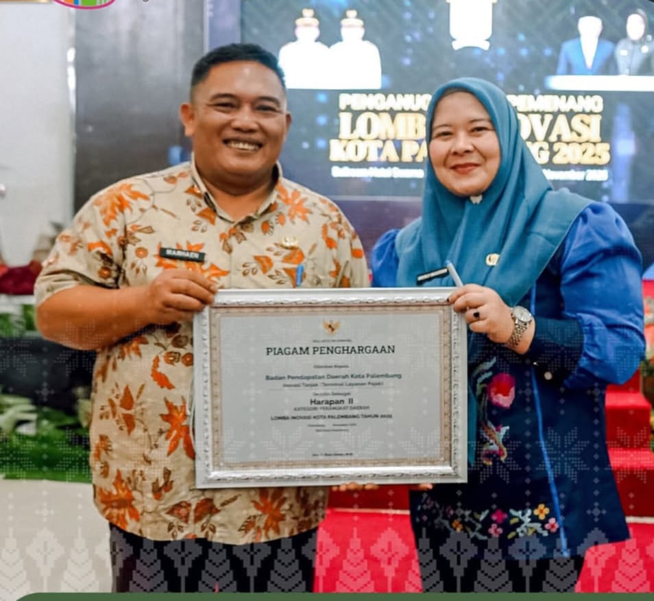 Palembang, Sriwijaya-hariini.com – Badan Pendapatan Daerah (Bapenda) Kota Palembang kembali menorehkan prestasi membanggakan. Pada Jumat, 28 November 2025, Kepala Bapenda Palembang Marhaen, SH., M.Si. bersama Plt. Sekretaris Bapenda Sherly Imelia Nasution, S.Kom., M.Kom. menerima Penghargaan Inovasi untuk program unggulan Terminal Layanan Pajak (TANJAK) dalam ajang Penganugerahan Pemenang Kompetisi Inovasi Kota Palembang yang digelar megah di Ballroom Hotel Swarna Dwipa.