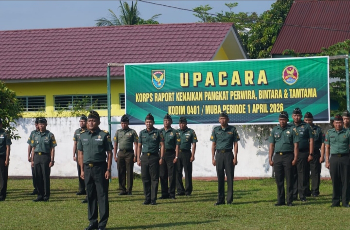 Muba,sriwijayahariini.com,,- Pendim0401/Muba – Komando Distrik Militer 0401/Muba menggelar acara laporan korps kenaikan pangkat prajurit di Lapangan Makodim 0401/Muba Kec. Sekayu Kab. Muba. Rabu (1/4/2026).