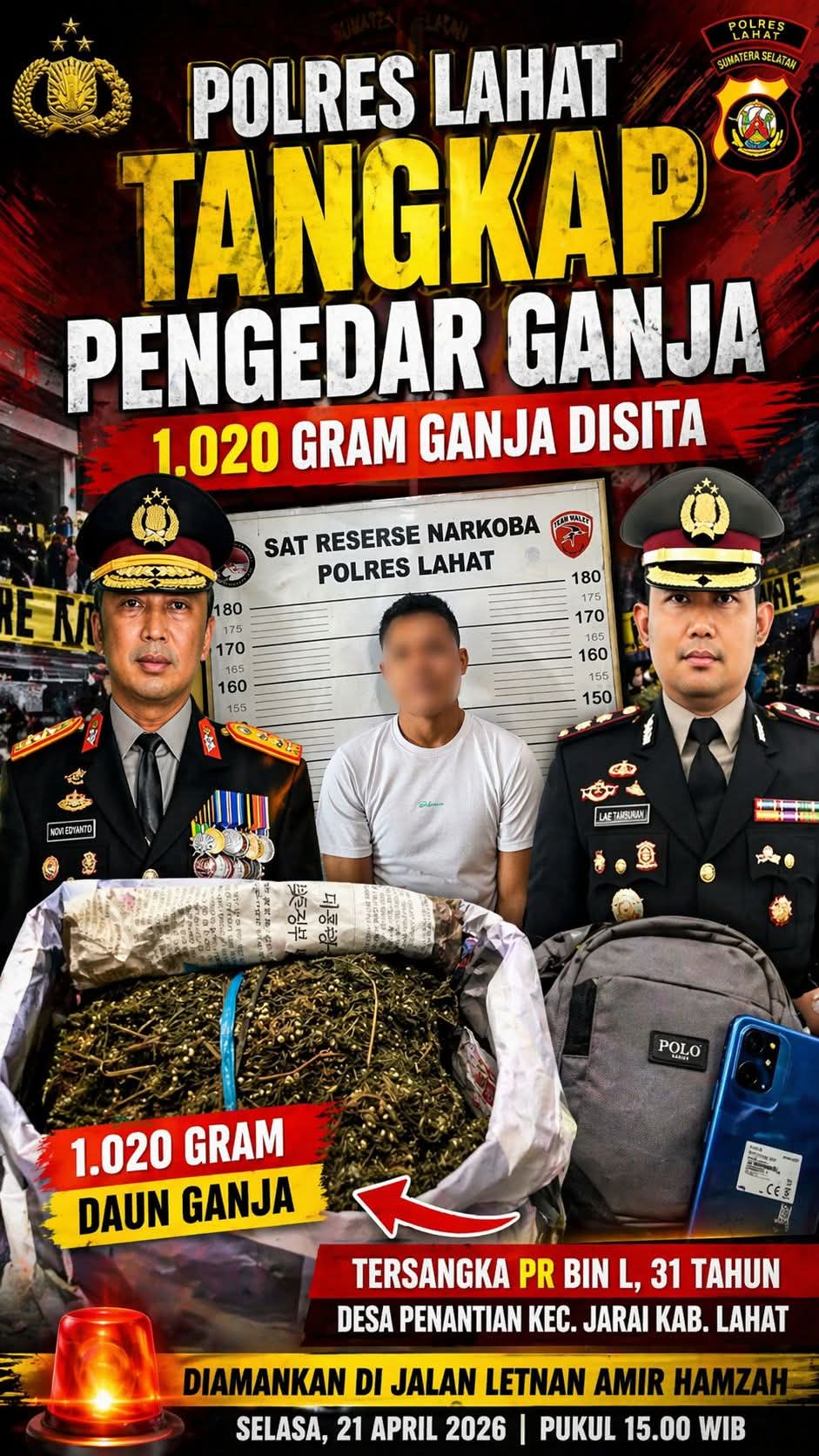 Penangkapan ini merupakan tindak lanjut dari Laporan Polisi Nomor LP/A/33/IV/2026 tertanggal 21 April 2026. Aksi tersebut dilakukan setelah petugas melakukan penyelidikan intensif, termasuk menindaklanjuti informasi dari masyarakat.